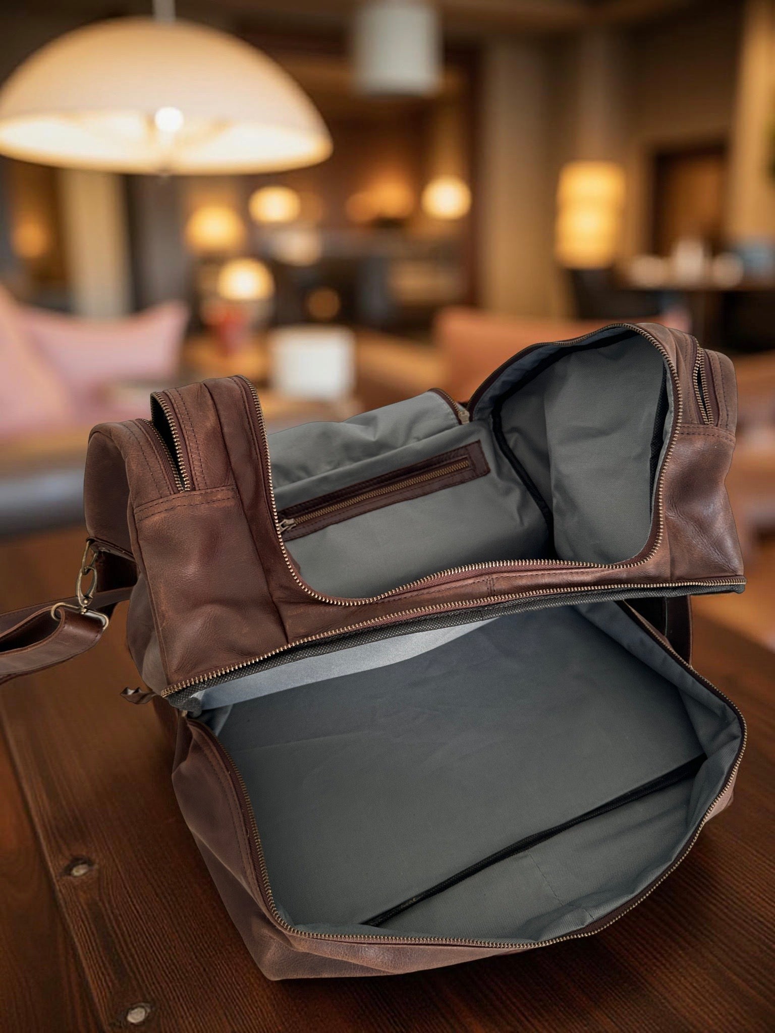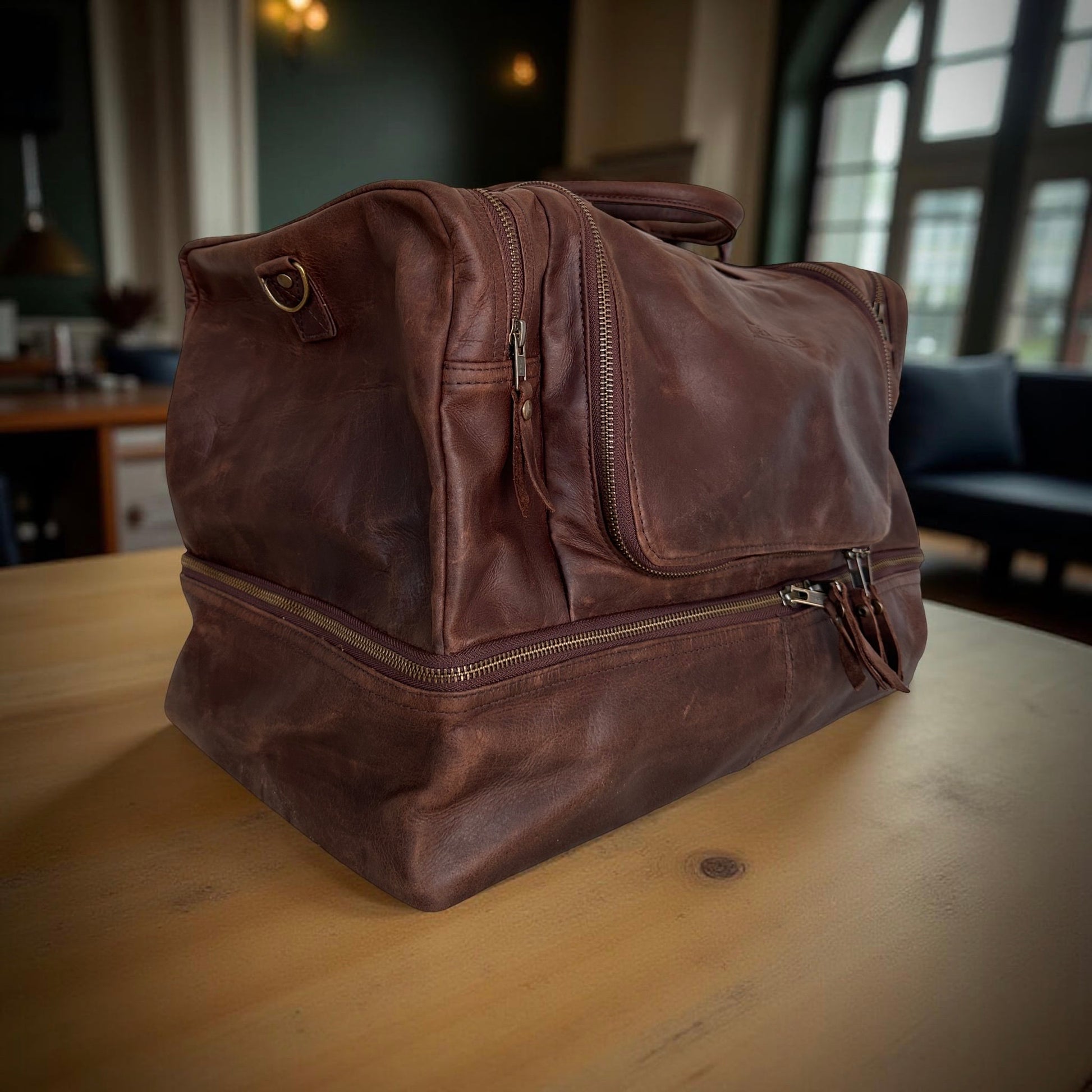 This is our very popular Carry On Travel Bag, your ultimate travel companion, designed for those who move with purpose and style. Inspired by the classic Weekender Bag, this carry-all is crafted from premium South African leather, offering unmatched durability and timeless sophistication.